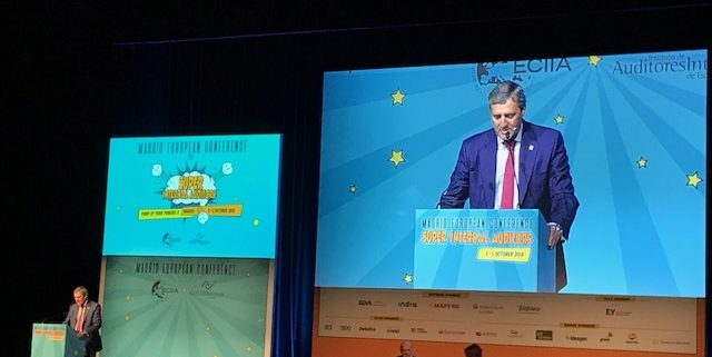 Nahezu 1.000 Revisoren aus Europa, Indonesien, Lateinamerika und riesige Delegation aus Süd Korea sind hier auf der ECIIA. Ernesto Martínez als Chairman of the Institute of Internal Auditors of Spain begrüßt das vor Ort Revisionspublikum, jedoch auch erstmalig die Online Gäste.