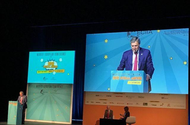 Nahezu 1.000 Revisoren aus Europa, Indonesien, Lateinamerika und riesige Delegation aus Süd Korea sind hier auf der ECIIA. Ernesto Martínez als Chairman of the Institute of Internal Auditors of Spain begrüßt das vor Ort Revisionspublikum, jedoch auch erstmalig die Online Gäste.